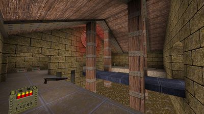 Should the game turn out to be very even and the time is nearing the end, and your team has a slight lead, it's possible to withdraw into a defensive position (sometimes called 'turtling'), either at start or Mega. Defending start is quite easy since there are a lot of places one can stand and have an advantage over anyone coming from either bridge (try standing among the boxes in the far side of the room, or on the arch over the door) or from Rocket Launcher (stand on the arch or in the window; reach it by jumping on the angled part of the pillar). The Mega also has its advantages; it's possible to stand on mega-high and spam grenades and rockets towards cross. Also, it's possible to rocketjump up to even higher levels in this room, although it's almost never used in games because it often does more damage than good. If and when the entrance to Mega is breached, the team can retreat to mega-exit and try to defend it (although this means you will be left with only a Super Nailgun, a few shells and 30 health; try to avoid this unless there's 20 seconds left of the game).